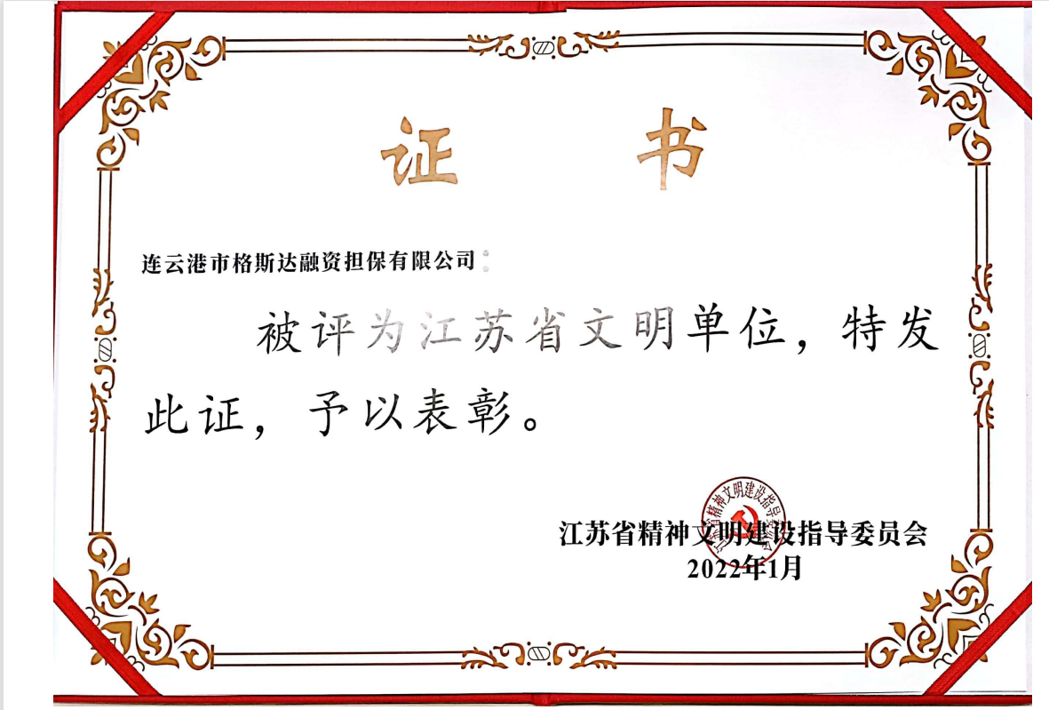 1月,格斯達擔保公司被省精神文明建設指導委員會評為“江蘇省文明單位”稱號。