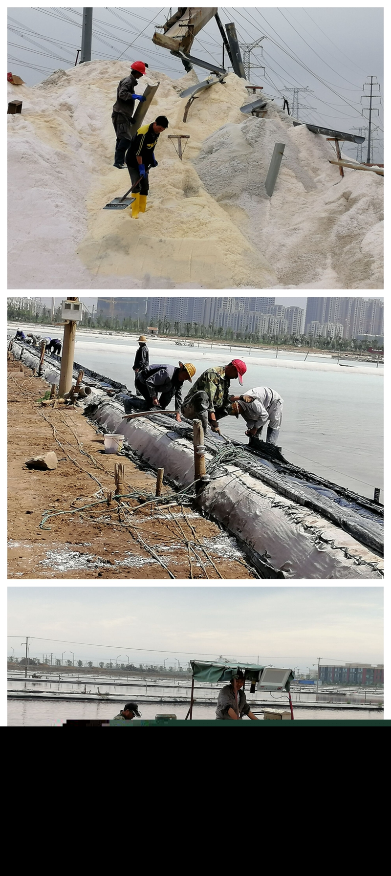 沒有參加扒鹽的人員也沒閑著,他們將工作重心轉移到苫布保鹽工作中來,苫鹽廩布、整理樁繩、修補、拉放塑布,對存鹽廩基等區域進行疏通加固,以及扒鹽后有序推進灘場文明等等。特別是東灘,為了盡早完成1680公畝的灌池任務,至三月初以來,工人們起早貪黑、放棄節假日克服一切困難,經過多方共同努力現已灌池1200多公畝,預估池內長鹽已達8000多噸。面對雨季即將到來之際,各單元在保證鹽色、鹽質做好安全扒鹽的同時,抓住晴好天氣強化大面積制鹵,加大走水深度和節制,充分利用蒸發量多制鹵、制好鹵為順利度過汛期做好一切準備。