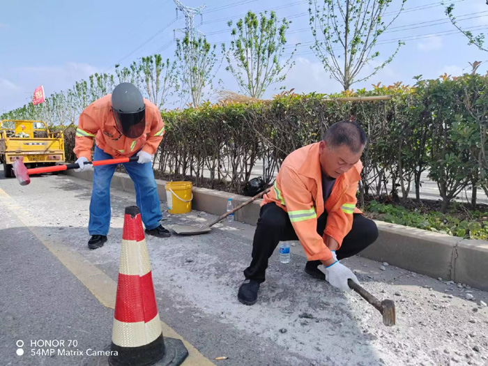 228省道西側,班長姚功巡查發現,有近50多米長混凝土攪伴拋灑主干道路面,如不及時處理,嚴重影響路面行車安全。班長姚功及時召集隊員,馬不停蹄趕赴道路現場上午10時左右,室外氣溫已經直逼35℃,大家顧不上天氣的炎熱,揮動手中鐵錘,不停地震動路面“凍結”已久的水泥,黨員胡可貴與同事徐育軍、伏彩林主動參戰,交替使用手中的撬棍,盡管汗水浸透橙色衣衫,雙手磨出了血泡,大家也沒有叫苦叫累,經過近三個多小的努力奮戰,終于恢復原有黑色柏油路面。