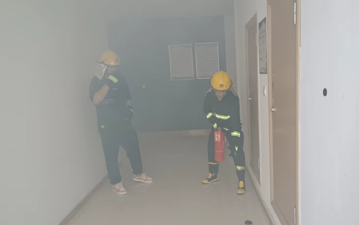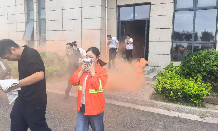 本次演練模擬公司辦公樓三樓電纜井因電路故障引發火情組織職工開展應急疏散。 “起火啦!”15時許,辦公樓三樓一電纜井內突然涌出滾滾濃煙。臨近人員發現著火后,第一時間使用滅火器進行撲救。濃煙觸發自動報警裝置,消防控制室值班人員接到警報后,立即通知志愿消防隊伍趕赴現場撲救,并撥打報警電話,向應急指揮部報告。公司應急指揮部立即啟動應急預案,滅火搶救組、安全救護組、緊急疏散組等應急小組隨即到位,有條不紊開展滅火、疏散等工作。消防救援隊伍到達現場后,接過現場指揮權,開展滅火救援。安全搶救組搜索受傷人員,并對受傷人員簡單急救后送往醫院進行治療,緊急疏散組立即組織辦公大樓人員,用濕毛巾捂住口鼻從應急通道撤離。10分鐘后,險情排除,應急救援結束。最后,組織部分人員開展滅火實操演練